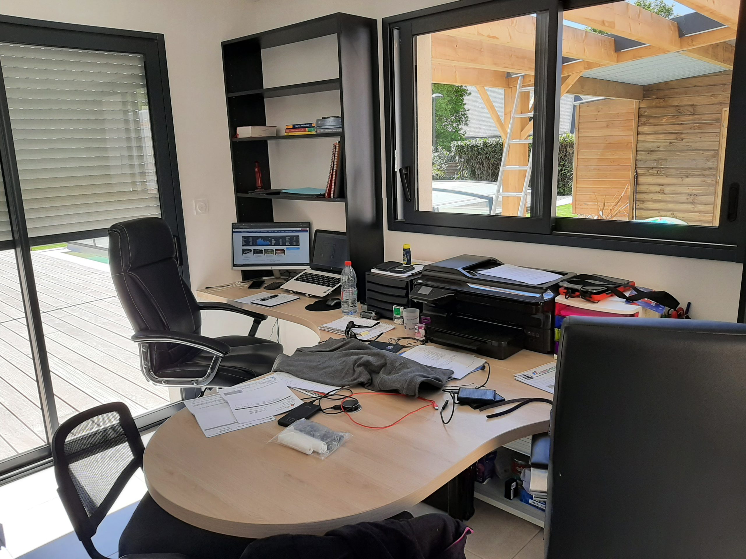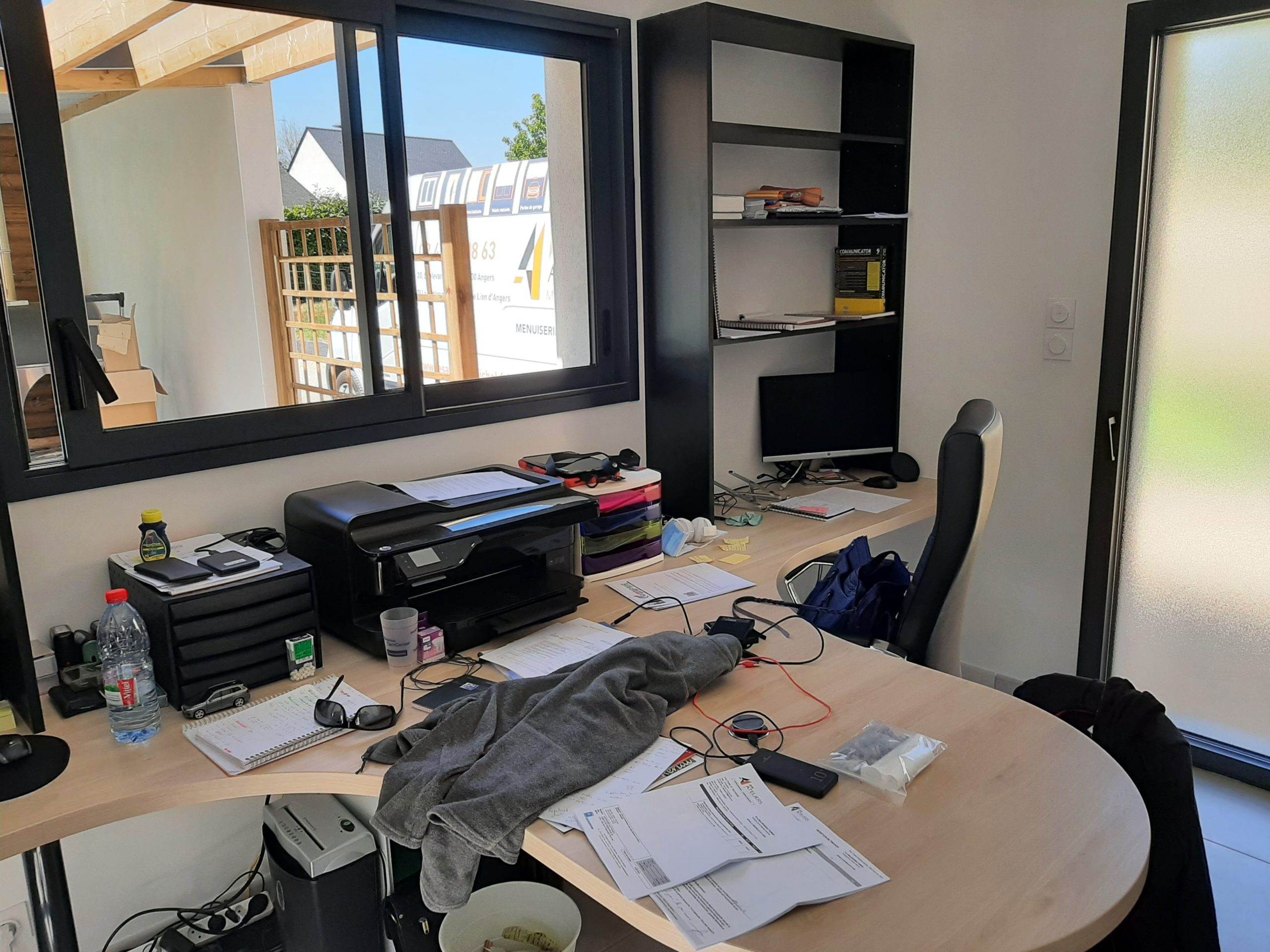 Les systèmes modulaires de bureaux offrent une certaine flexibilité dans la gestion de l’espace et du rangement. Mais avec un bureau sur mesure, tout est possible ! Avec cette réalisation, le bureau utilise toute la longueur de mur disponible. Une étagère parfaitement intégrée permet d’obtenir de l’espace de rangement au-dessus de l’ordinateur et de l’écran.
