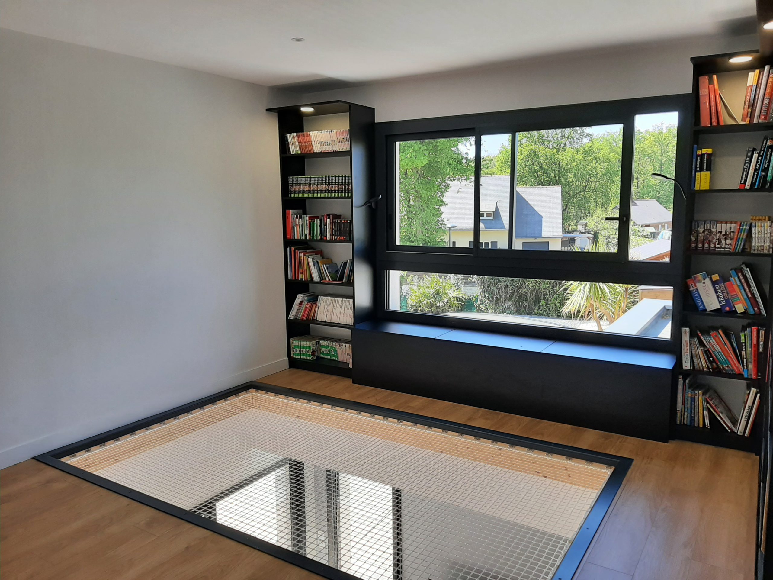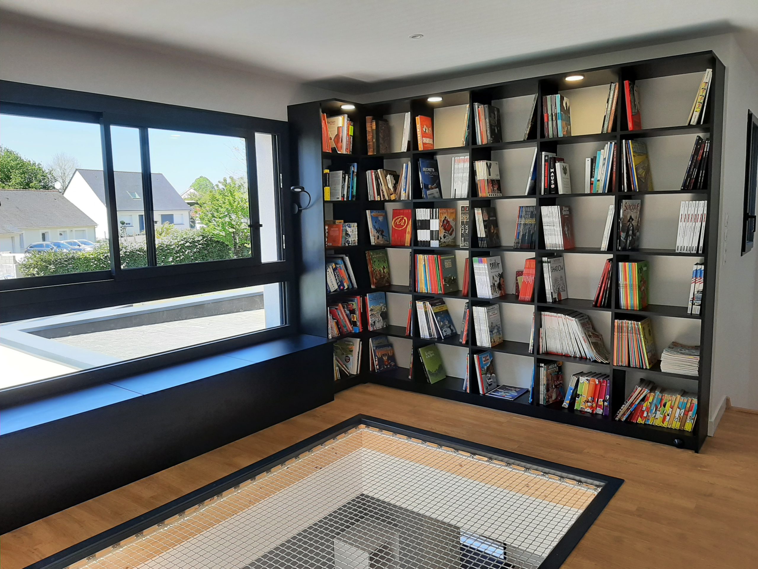 Pour ce client passionné de littérature, il fallait un coin lecture adapté. Grâce à la bibliothèque sur mesure des Ateliers Michel d’Angers, il pourra l’enrichir comme bon lui semble durant de nombreuses années. Le petit pan de mur situé à côté de la fenêtre est exploité. La bibliothèque personnalisée remonte tout au long de l’autre pan. Un éclairage a été prévu pour accentuer l’esthétisme de l’ensemble. Enfin, une assise a été installée sous la fenêtre pour profiter du confort de lire sous une lumière naturelle.