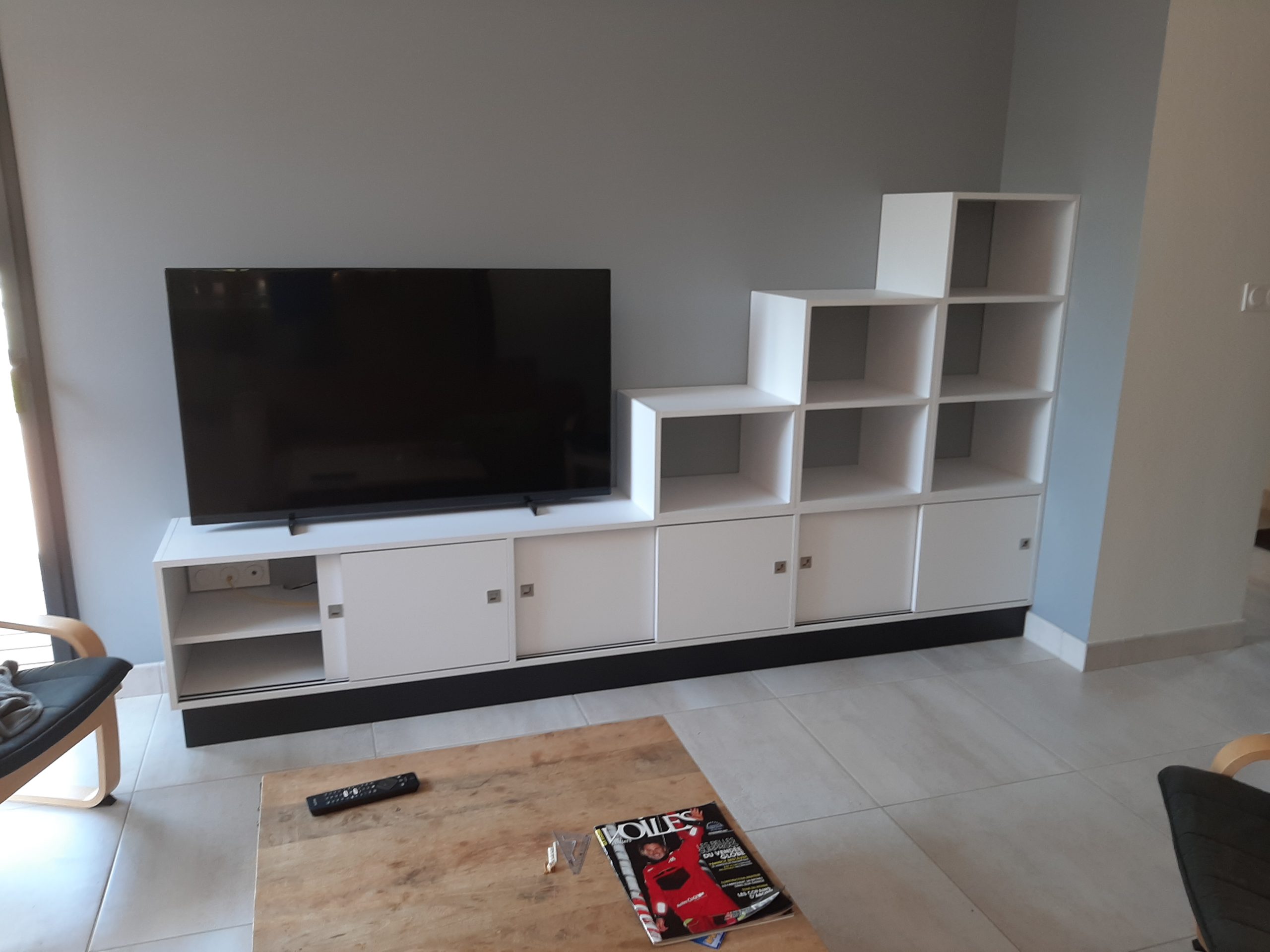 Enfin, notre dernier meuble fait à la demande est un meuble télé personnalisée. La partie plane a été prévue pour accueillir un écran plat de dimensions généreuses. Le meuble occulte les prises. Des rangements à portes coulissantes sont prévus en dessous, tandis que des baies en escalier peuvent accueillir de petits livres ou des bibelots. Ces cases ont été pensées pour être totalement modulables : le client peut les déplacer comme bon lui semble pour les mettre à gauche, à droite ou créer une forme différente avec.