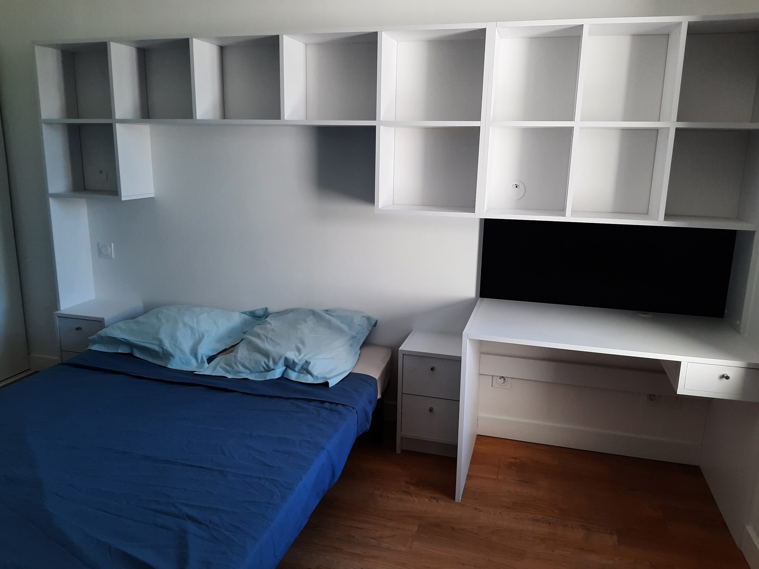 Dans les nouvelles constructions, les chambres présentent parfois des superficies réduites. Afin de gagner en espace de rangement, le lit pont est idéal. Pour ce client, nous avons réalisé plusieurs lits ponts sur mesure qui utilisent au millimètre près toute la largeur de la chambre. La largeur des tables de nuit a été calculée pour ne pas empiéter sur les prises électriques. Il suffit de glisser le lit au milieu, et le tour est joué !