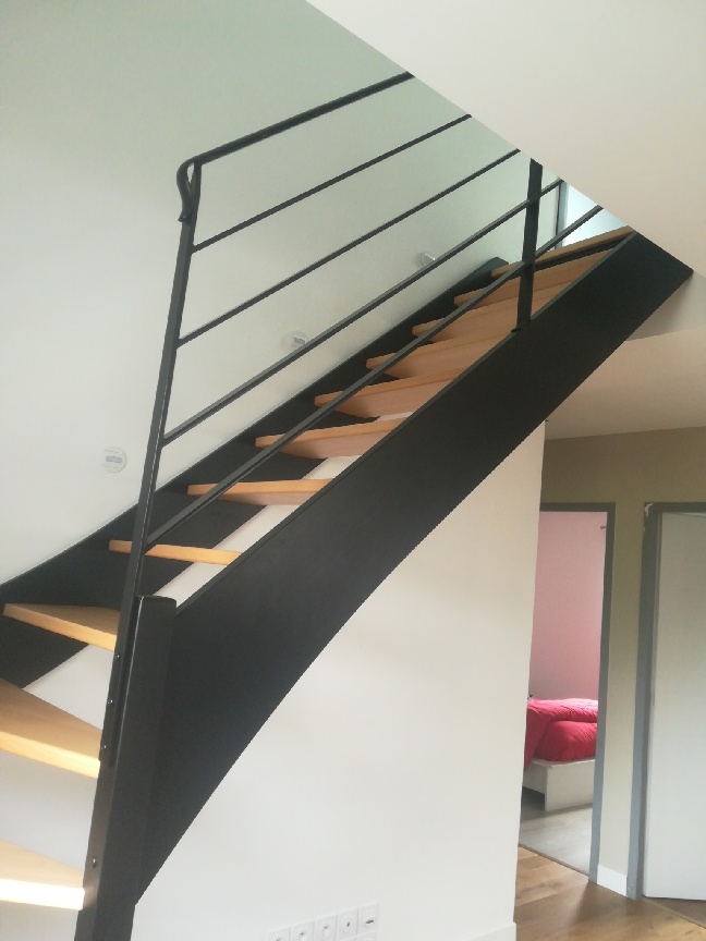Pose d’un escalier contemporain design en bois et acier à Angers.