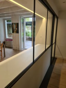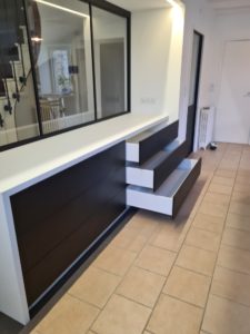 Pour répondre à cette demande, notre équipe a conçu et fabriqué un grand meuble à tiroirs sur mesure, servant d’allège et de base à une verrière en aluminium laqué noir, accompagnée de sa porte coulissante assortie.